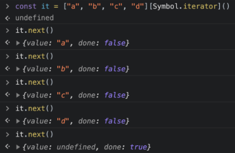 - The execution of this Symbol.iterator returns an iterator Object, who respects the iterator protocol (will see in a minute).