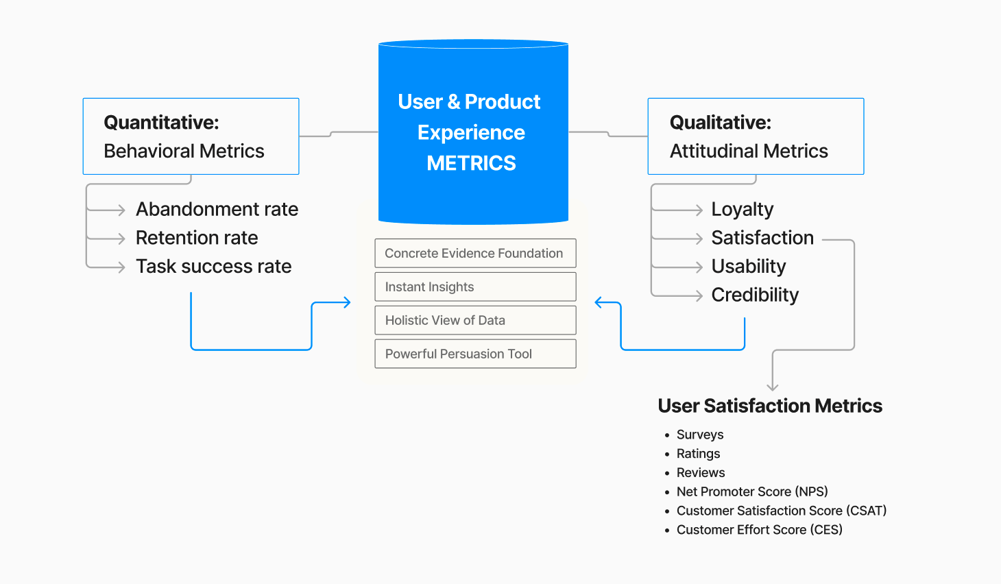 - Quantitative Behavioral Metrics: Focus on user interactions with your product (e.g., abandonment rate, retention rate, task success rate).